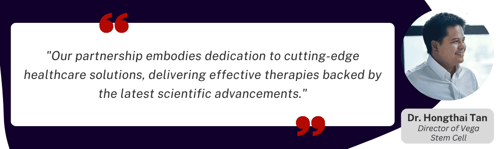 El Dr. Hongthai Tan , director general de Vega Stem Cell Clinic , añade: «Mediante nuestros esfuerzos conjuntos, aspiramos a ser pioneros en soluciones basadas en la investigación, garantizando que nuestras terapias no solo sean eficaces, sino que también estén respaldadas por los últimos avances científicos. Nuestra colaboración simboliza un compromiso con la excelencia y la innovación en la atención médica».