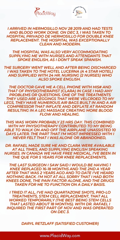 " Llegué a Hermosillo el 28 de noviembre de 2019 y me hicieron pruebas y análisis de sangre. El 3 de diciembre, me llevaron al Hospital Privado de Hermosillo para un reemplazo doble de rodilla. El hospital estaba excepcionalmente limpio y era moderno. El hospital también fue muy servicial y me proporcionó enfermeras y asistentes que hablaban inglés, ya que no hablo español. La cirugía salió bien y después de que me dieron el alta me llevaron al Hotel Lucerna (un hotel de 4 estrellas) y me proporcionaron enfermería las 24 horas (2 enfermeras) que también hablaban inglés. "