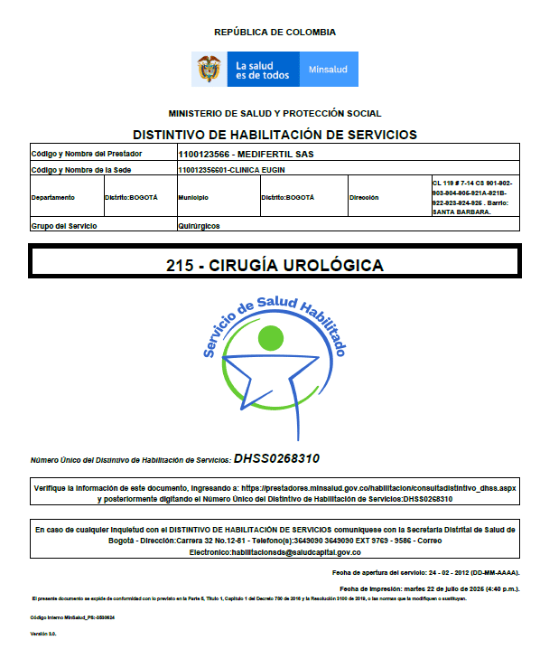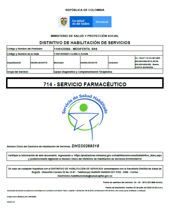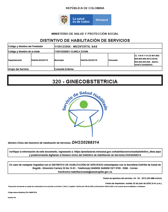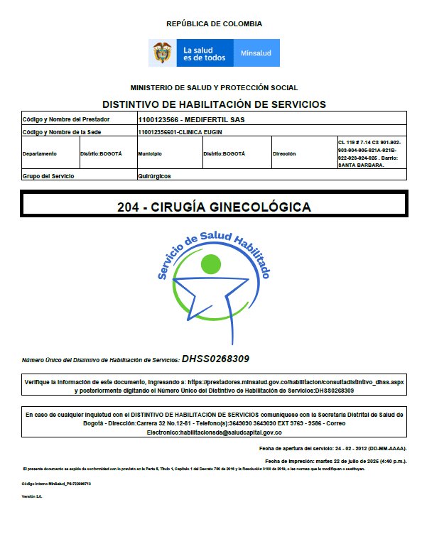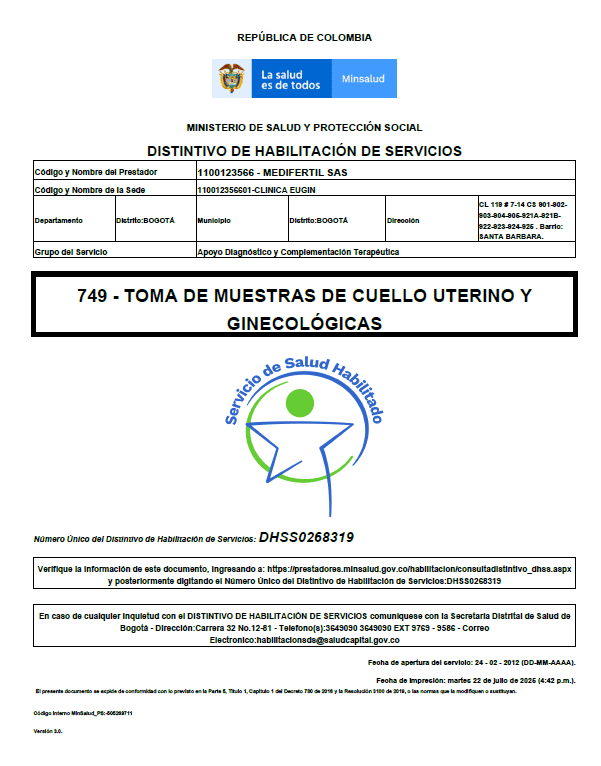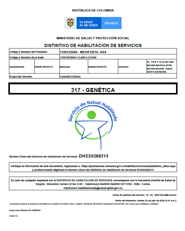 Certificado del Ministerio de Salud, Eugin Colombia FIV