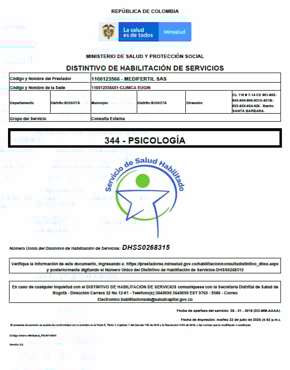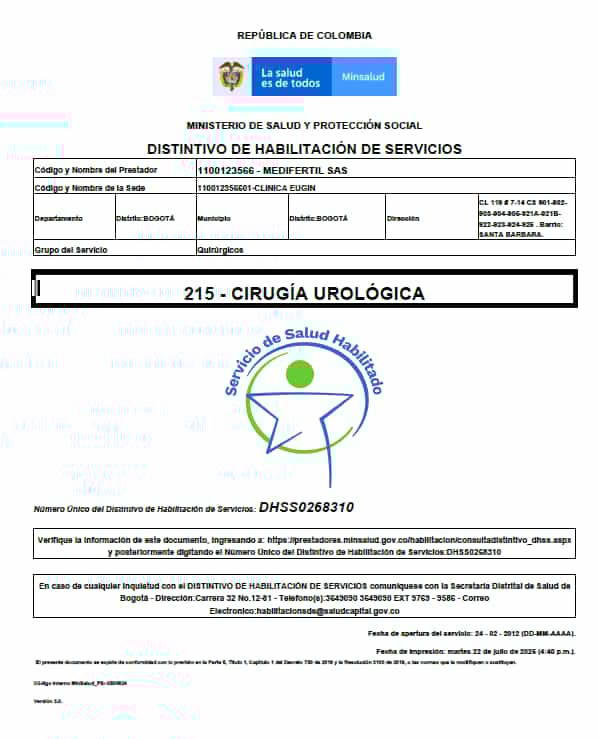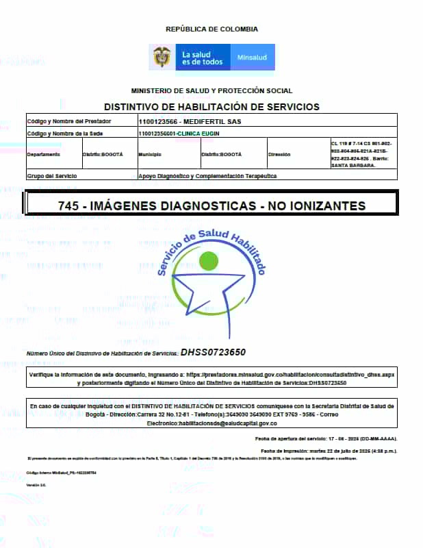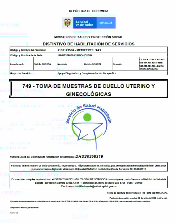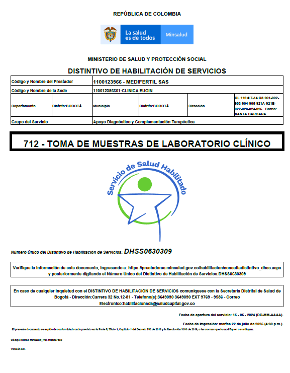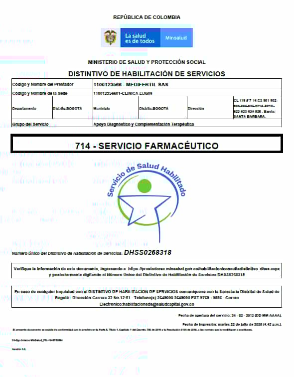 Certificado del Ministerio de Salud, Eugin Colombia FIV